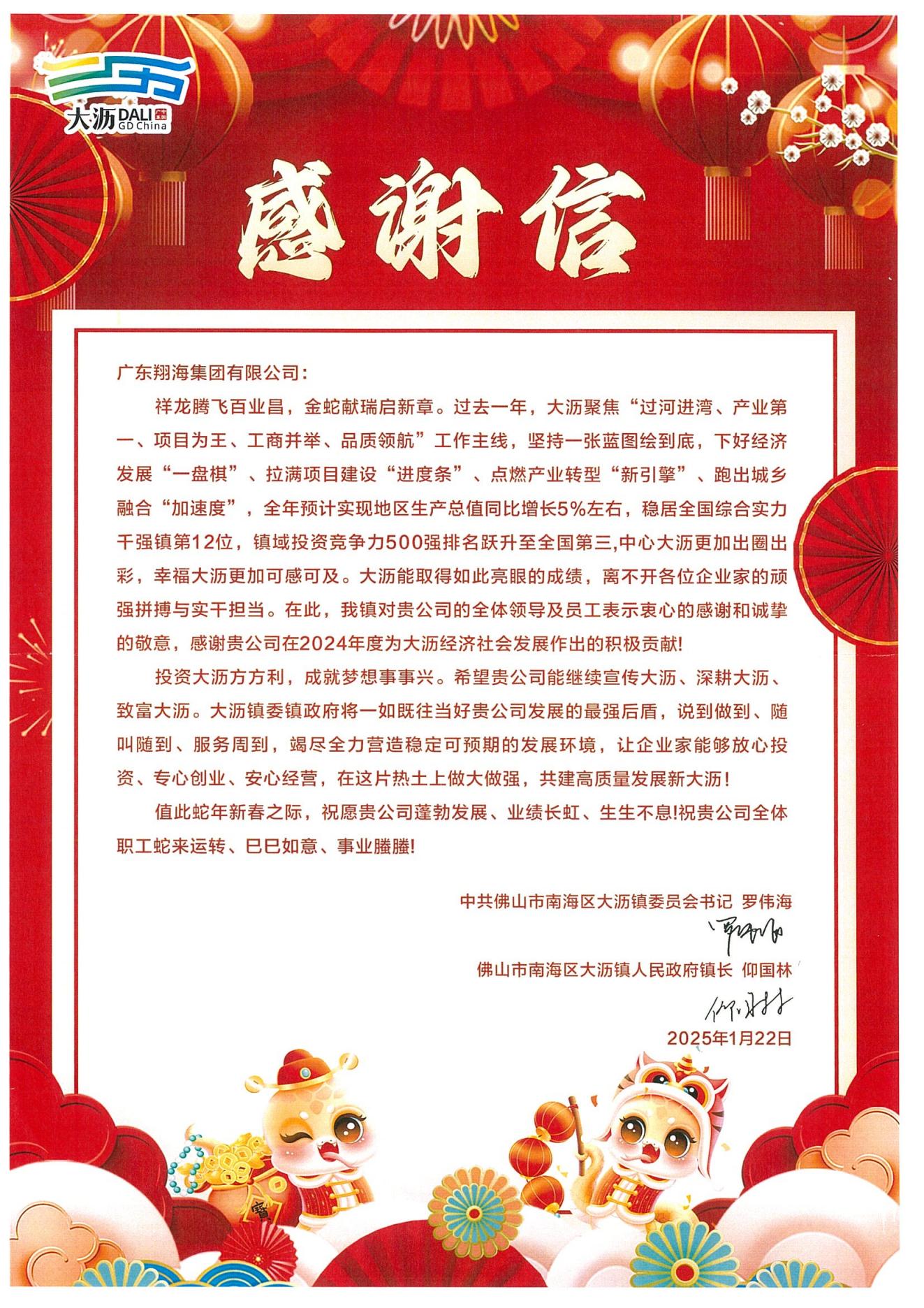 开云集团中国有限公司官网深感荣幸,新春之际收到了一封来自大沥镇政府的感谢信。作为大沥的本土企业,我们深知企业的成长离不开当地政府和社会各界的支持与厚爱。在此,我们衷心感谢大沥镇委镇政府,感谢各位合作伙伴的鼎力支持和信任。