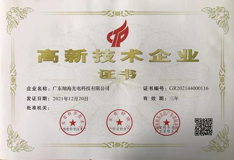 热烈祝贺翔海光电获得《高新技术企业证书》